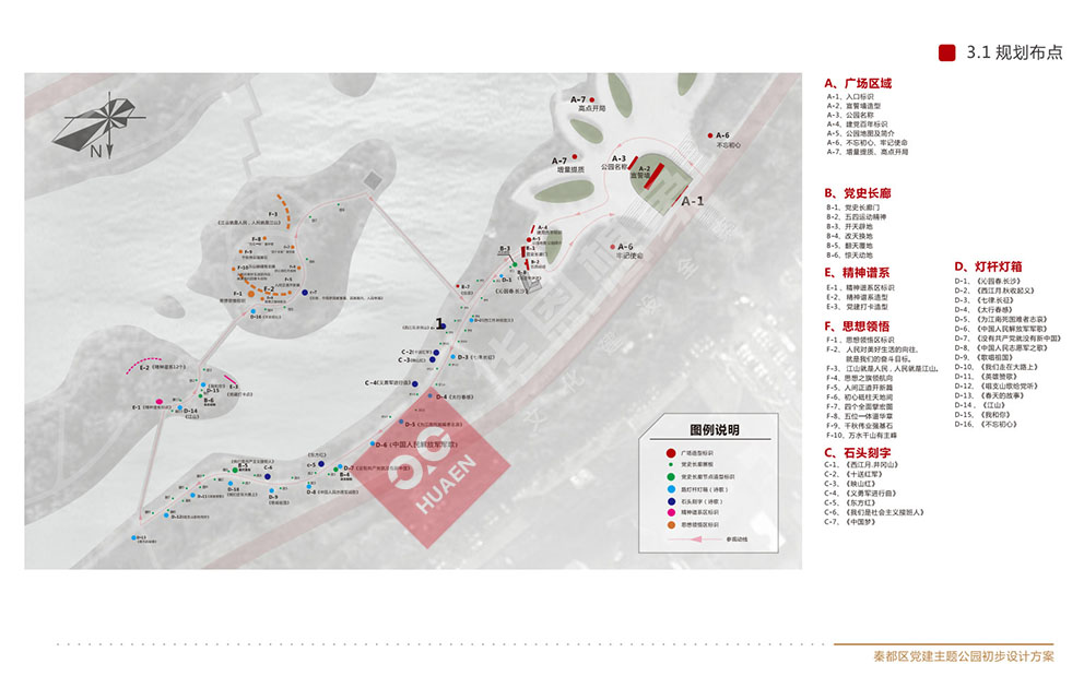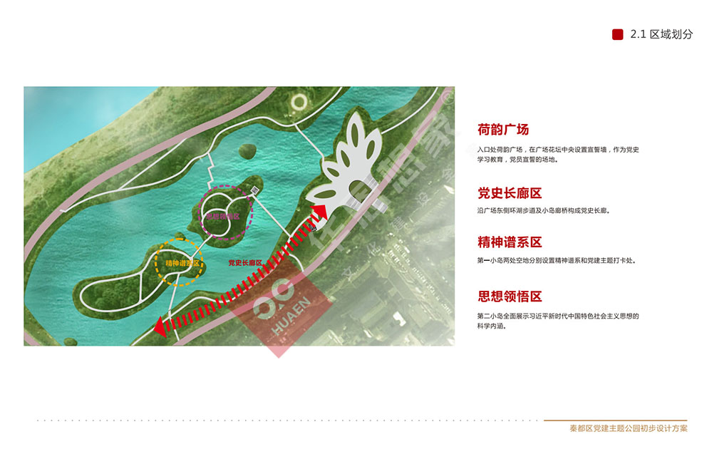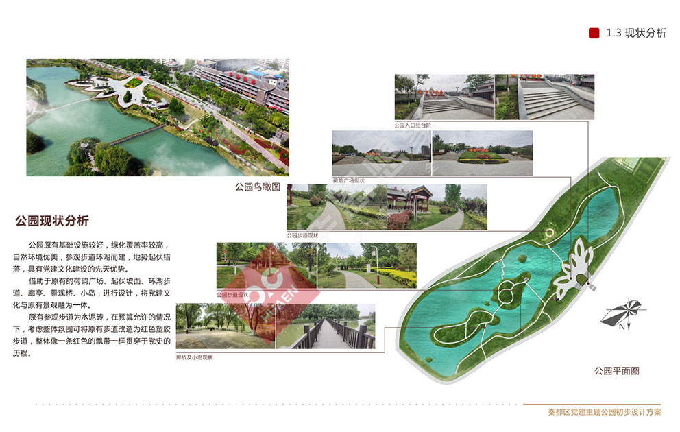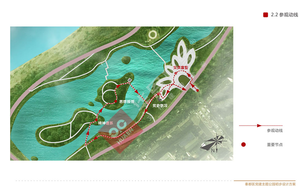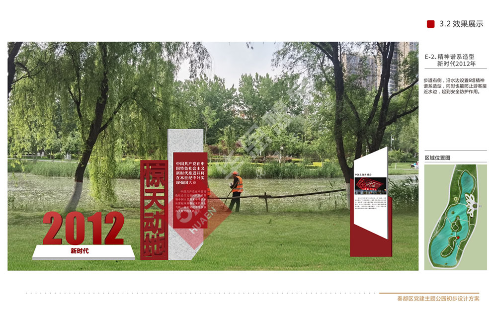設(shè)計(jì)理念:秦都區(qū)黨建主題公園位于咸陽湖畔,濱河西路南側(cè)。在原有公園基礎(chǔ)上,選取靠北長約180米,寬約100米,占地面積18000平米進(jìn)行打造,充分將黨史文化、人文景觀融于一體,打造成集黨史學(xué)習(xí)教育、休閑健身、文化傳承,陶冶情操于一體的黨建主題公園。